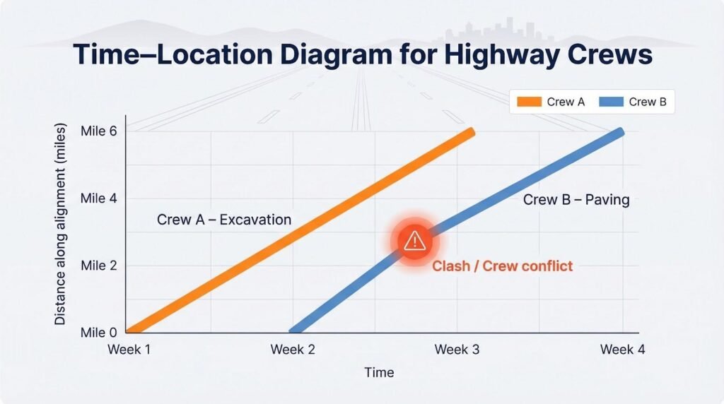 When work moves down a corridor—rail line, pipeline, roadway—you care less about dates and more about where Crew A will cross paths with Crew B. Only a time-location diagram flags that clash before it happens.