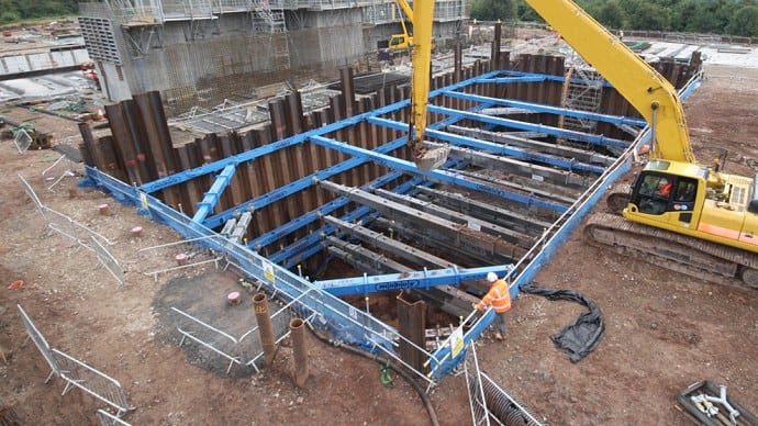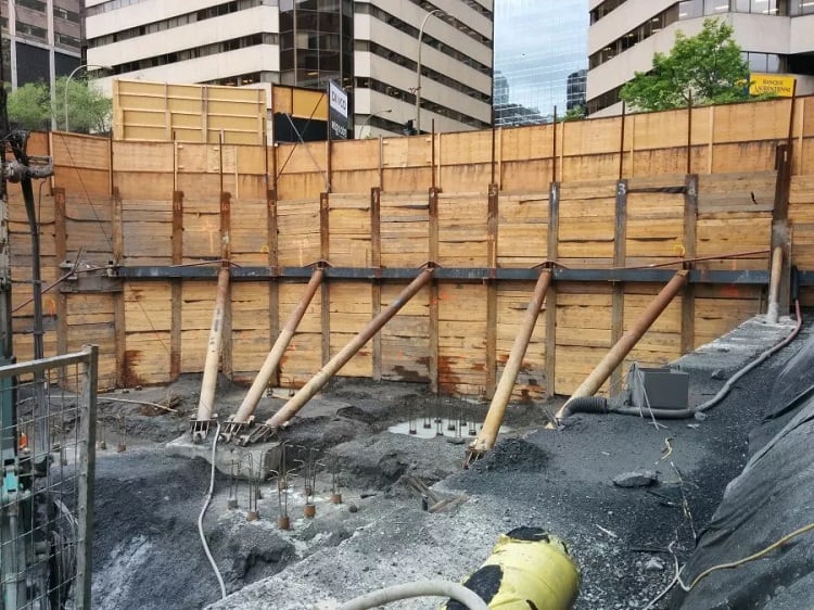 These horizontal struts, if appropriately spaced, can act as the framing for a basement in your building. Although horizontal struts are not as strong and foolproof as a whole concrete floor bolted to a foundation, which is what you would build in the top-down method, they do a fair job of decreasing strain on your retaining walls.