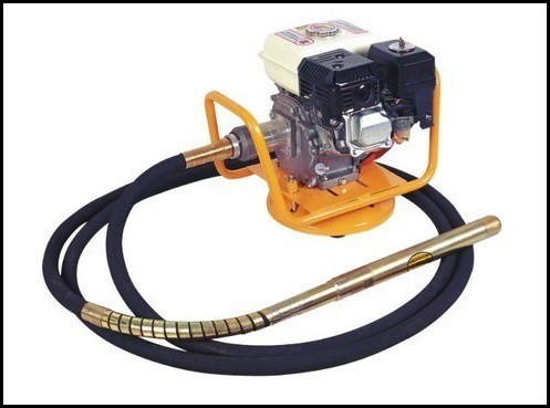 It comprises a steel tube with an eccentric vibrating element within (one end closed and rounded). The poker vibrator machine comprises a steel tube connected to an electric motor, a diesel engine, or a gasoline engine via a flexible tube.