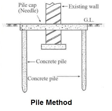 In this process, concrete piles are pushed on both sides of the wall. The needle beams are then used over the piles through the wall, where the needle beams act as pile caps. It alleviates the load from the wall.