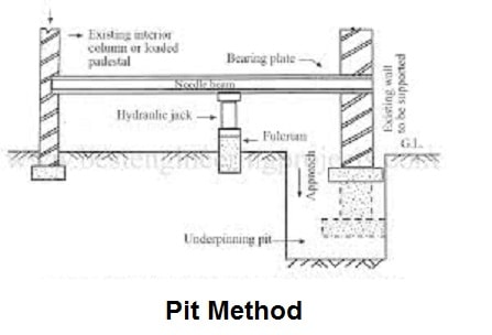 In this method, short length columns of 1.2 m to 1.8 m are underpinned. First, holes are cut in the wall above the ground level at common intervals and strong needles are then inserted through the holes to carry the entire load of the structure. Generally, the needles are made of timber beam or steel joist.